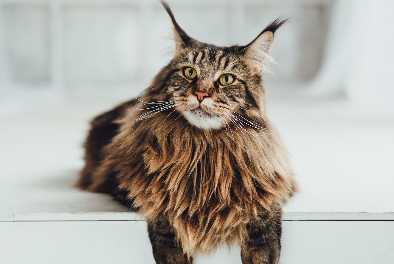Maine Coons are large in size, with males reaching up to 97 cm in length. Cats of this breed have long, smooth and shaggy coat. They are built proportionally with a medium in size head and a visibly squared muzzle. Maine Coons have a muscular and solid body and broad chest. The tail is long and heavily furred, resembling a racoon’s tail. This breed has large and well-tufted ears and expressive, wide-set eyes. Maine Coons take longer to physically mature than other cat breeds - their full size is normally not reached until they are three to five years old, while other cats take about one year.
